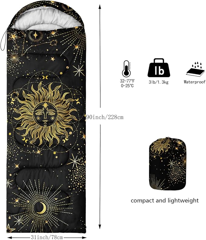 - 🌈【Fashion Design】SIZE - 31 by 90 inches (W x D). Our sleeping bag can be used in 3 seasons with a design temperature of 32℉-77℉(0℃-25℃). These bags also have a weather resistant waterproof design to keep you warm and prevent you from any dampness.
