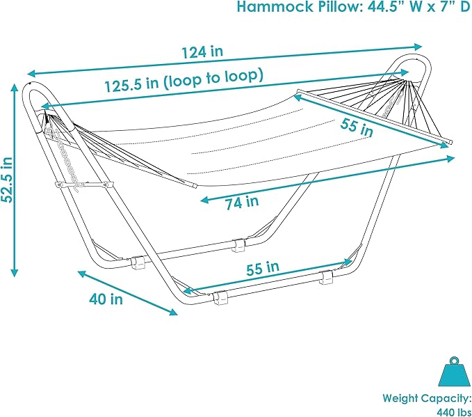 - EXTRA SPACE FOR TWO PEOPLE: This large freestanding quilted hammock with stand measures 125.5" W x 55" D x 52.5" H. The stand dimensions are 124" W x 40" D x 52.5" H, and it weighs 25 lbs. The hammock measures 125.5" W x 55" D x 1" H and weighs 11 lbs. With the included attached chains and hardware, this stand will fit hammocks ranging from 9.5 feet to 14 feet long. The weight capacity is 440 lbs. The overall weight of the hammock and stand is a combined 36 lbs.