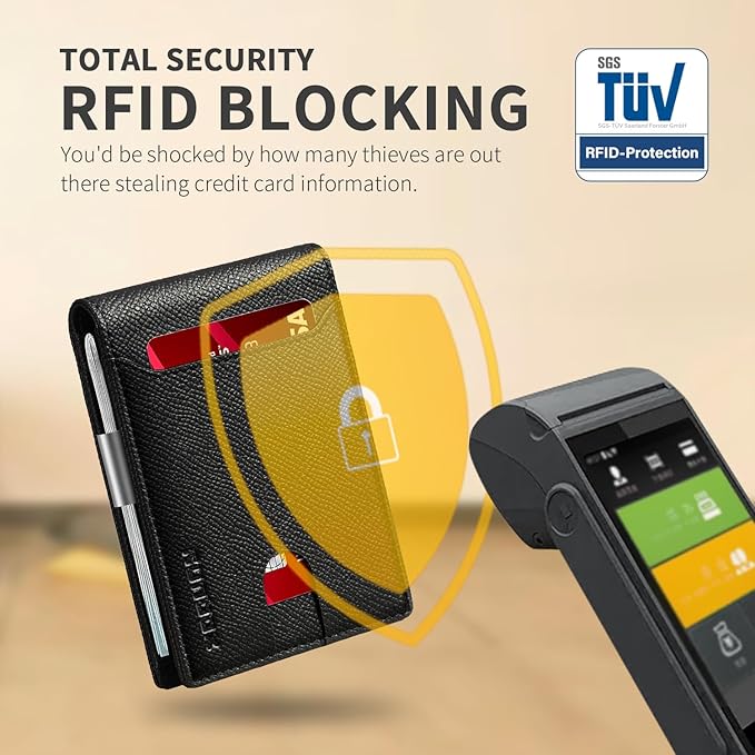 - šš šš šš§šš¢-šš”ššš šššššššš - this slim wallet for men equipped with German Instiute Certified RFID Security technology, a unique metal composite, engineered specifically to block 13.56 MHz or higher RFID signals to protect the valuable information and privacy
