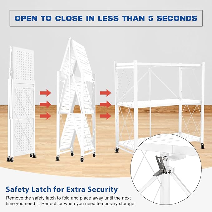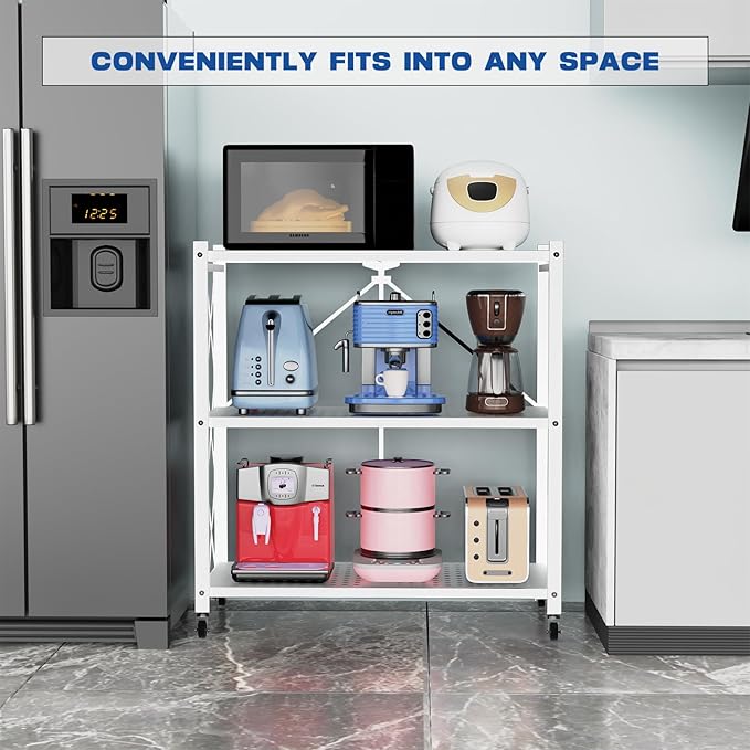 3-Tier Foldable Storage Shelf with Wheels - Metal Rack Collapsible Shelving Unit Display, Rolling Cart for Books Kitchen Storage Shelves, Pantry & Closet Organizer, Office Room Decor