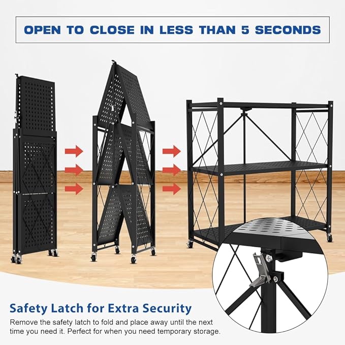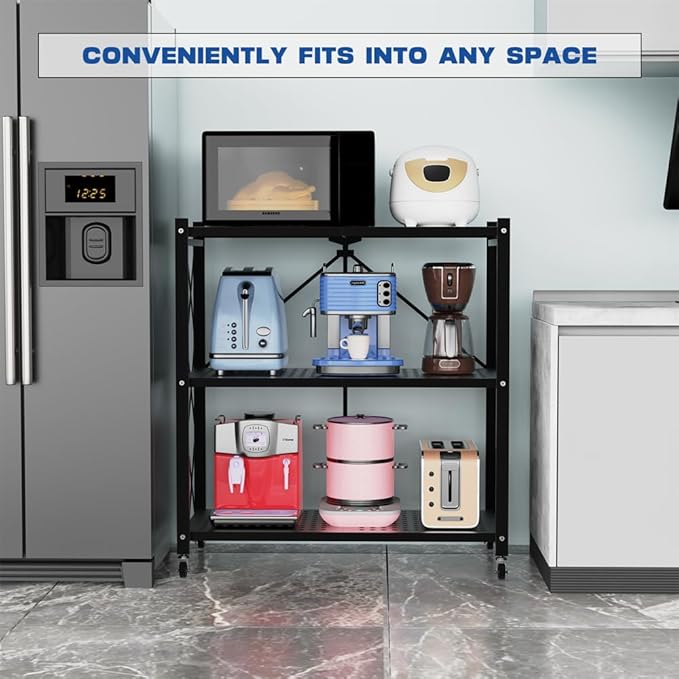 3-Tier Foldable Storage Shelf with Wheels - Metal Rack Collapsible Shelving Unit Display, Rolling Cart for Books Kitchen Storage Shelves, Pantry & Closet Organizer, Office Room Decor
