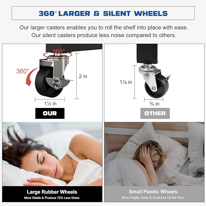 - ✅【 Extra Durable & Light】This folding shelf is made of heavy duty materials able to store up to 90 lbs on each level. It is scratch-resistant, waterproof, and rustproof, ensuring its durability to last through many years of long term use. This cart is equipped not only with silent wheels that enable quiet shelf movement, but also features larger wheels that make moving heavier items on the shelf much easier. Wheels are lockable, removable, and offer 360 degrees of movement.