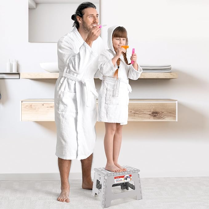 - Details & Dimensions: The stepping stool is compact at 9"H×11.2"L×8.5" W when opened and 13"H ×12.5"L×1.7" W when folded. Anyone wearing a shoe size 13 or less can stand up fully on both feet without worrying that the step stool is too small. Completely suitable for adults.