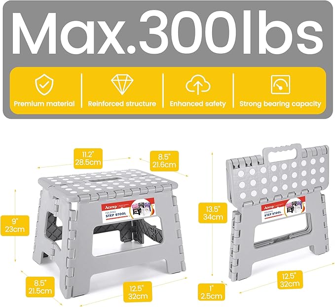 - Strong & Sturdy: The material is made of tough, Sustained, heavy-duty plastic that won't collapse or shake easily, by high quality standards. ACSTEP folding step stool has been approved by EN 14183 Certificate, all products are qualified factory test.