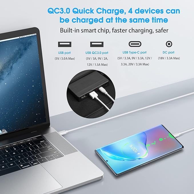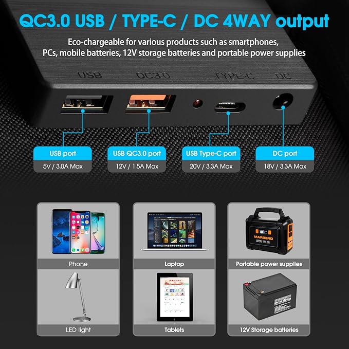 - Multiple Output Ports for Different Occasions: the 60W portable solar panel designed with different USB output ports type: 1* USB port ( 5V/3A Max), 1* QC3.0 USB ( 5V/3A, 9V/2A, 12V/1.5A), 1* USB C(5V/3.3A, 9V/3.3A, 12V/3.3A,20V/3.3A), can quickly charge your smartphone, laptop, tablets, ipad, power bank, speaker, GPS, USB fan, camera or other USB devices at the same time. The build-in smart IC chip intelligently identifies your device, and maximizes its charging speed while protects your devices from over charging and overloading.