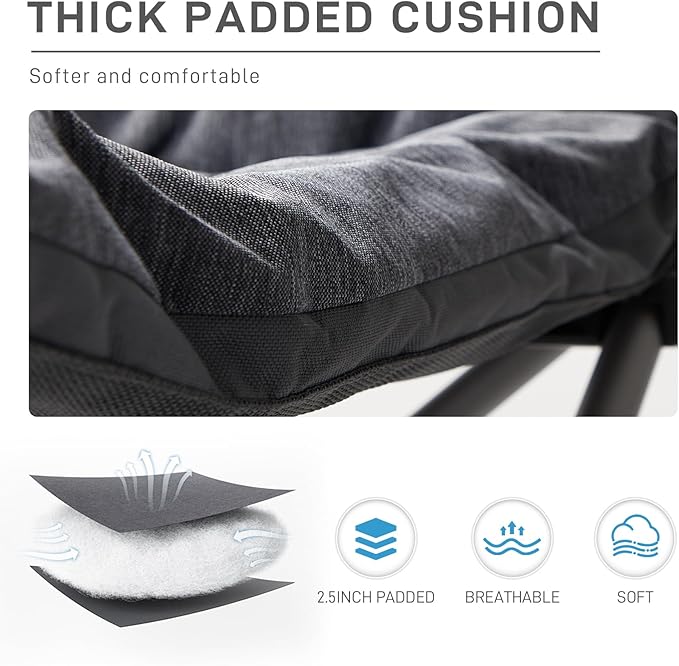 - 【Double Camping Chair】Designed with extra long and wide seat surface, suitable for 2 person, this camping loveseat can bring you and your family or friends a pleasant relaxing experience. With the high backrest of the 2 person camping chair and the thick padded cushion, this folding sofa is especially comfortable and keep you cozy all the time.
