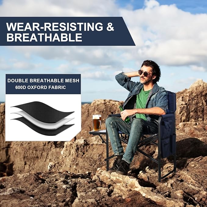 - 【MESH FABRC BREATHABLE】Certain parts of folding directors chairs outdoor are designed with breathable mesh fabric, allowing for improved airflow and a cool seating experience.