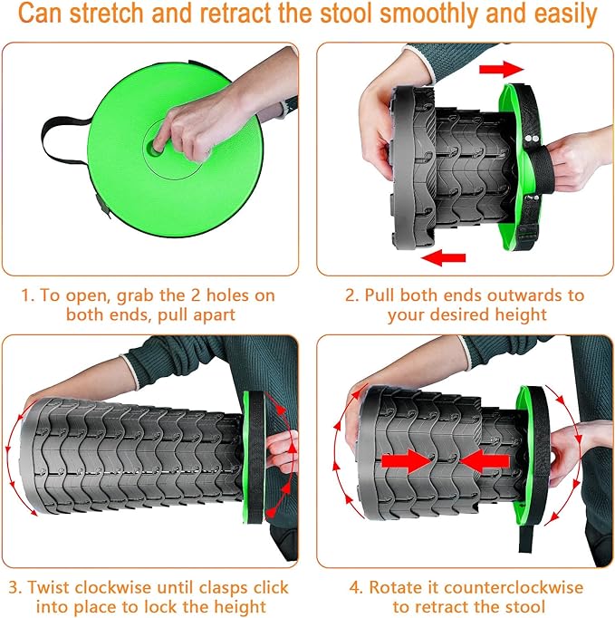 - STRETCH AND RETRACT SMOOTHLY AND EASILY: Benefiting from the fish scale design and our high precision production equipment, scales interlamellar spacing is kept 0.1mm. Make sure the stool’s stretch and retract smoothly and easily. You can open and close the stool in just seconds.