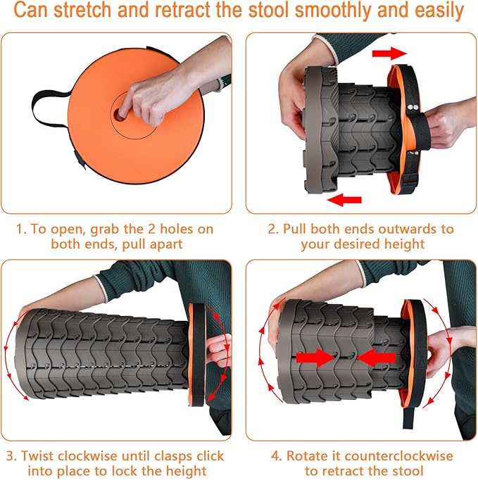 - STRETCH AND RETRACT SMOOTHLY AND EASILY: Benefiting from the fish scale design and our high precision production equipment, scales interlamellar spacing is kept 0.1mm. Make sure the stool’s stretch and retract smoothly and easily. You can open and close the stool in just seconds.