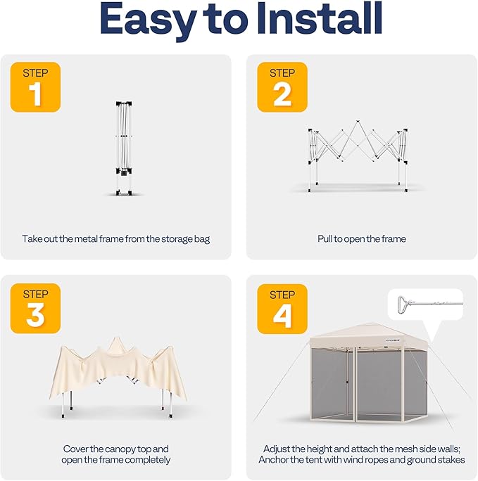 - SIMPLE INSTALLATION - The screened canopy comes with a pre-assembled pop-up frame, making it effortless for a single person to set it up without needing additional tools; Adhesive straps firmly secure the top cover to the frame, and thumb-friendly buttons simplify adjusting the canopy height; The metal feet plate, ground nails, and wind ropes are combined to keep it firmly anchored to the ground in windy conditions
