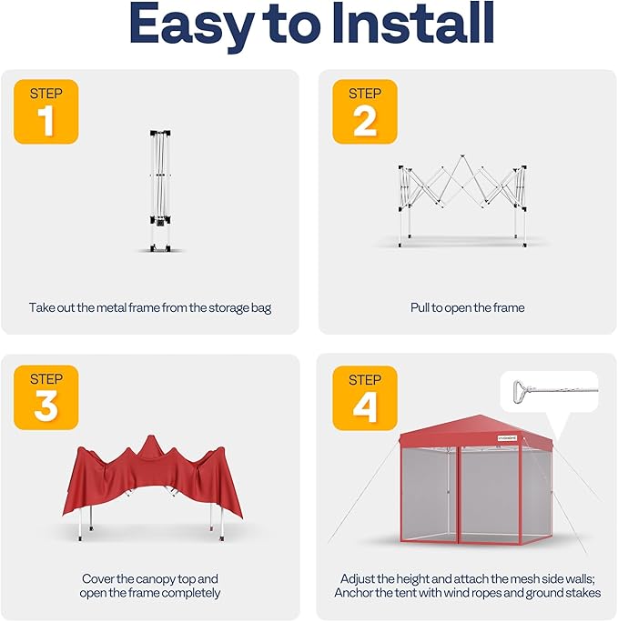 - SIMPLE INSTALLATION - The screened canopy comes with a pre-assembled pop up frame, making it effortless for a single person to set it up without needing additional tools; Adhesive straps firmly secure the top cover to the frame, and thumb-friendly buttons simplify adjusting the canopy height; The metal feet plate, ground nails, and wind ropes are combined to keep it firmly anchored to the ground in windy conditions