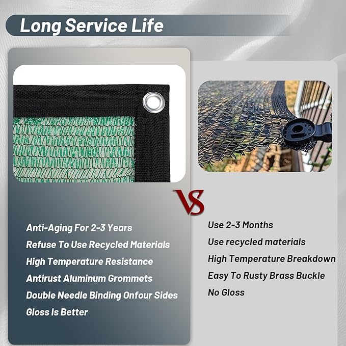 - ??5% Shading Rate?‘Made of 100% New High Density Polyethylene (HDPE) fabric material, has a shading rate up to 55% can avoiding direct sunlight while allowing free air circulation.