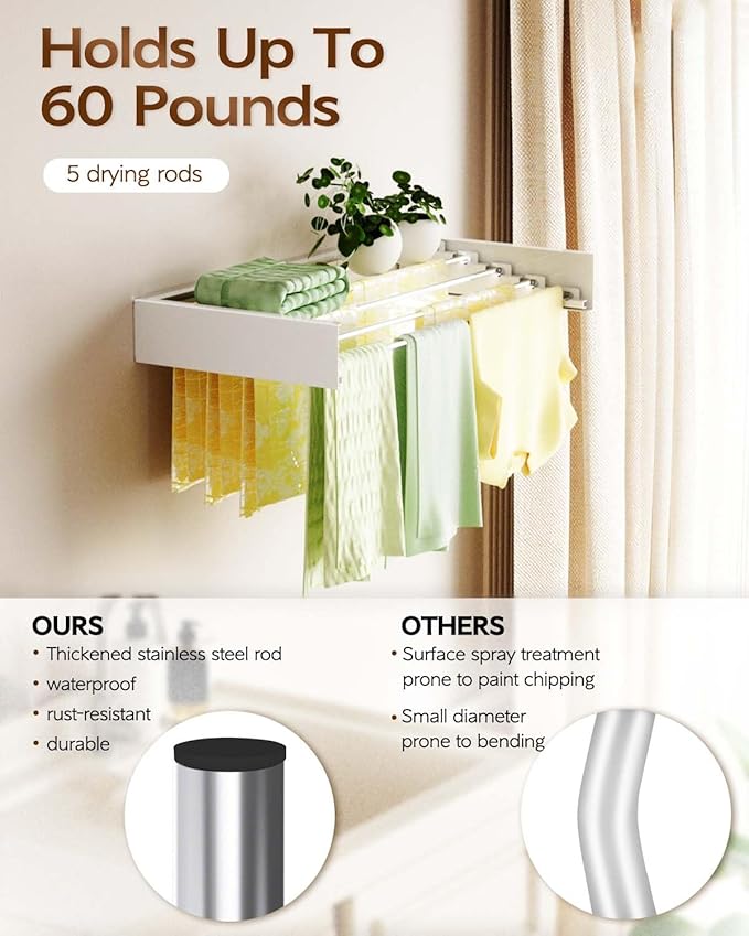 - Heavy Duty & Sturdy: 5 drying rods of the foldable clothes drying rack are made from premium stainless steel, noticeably thicker and more robust than the standard silver pipes seen in the market, without risk of bending or deformation. 40lbs Capacity. This clothes dryer rack takes up little room, but when open you can fit so much! Compact yet functional