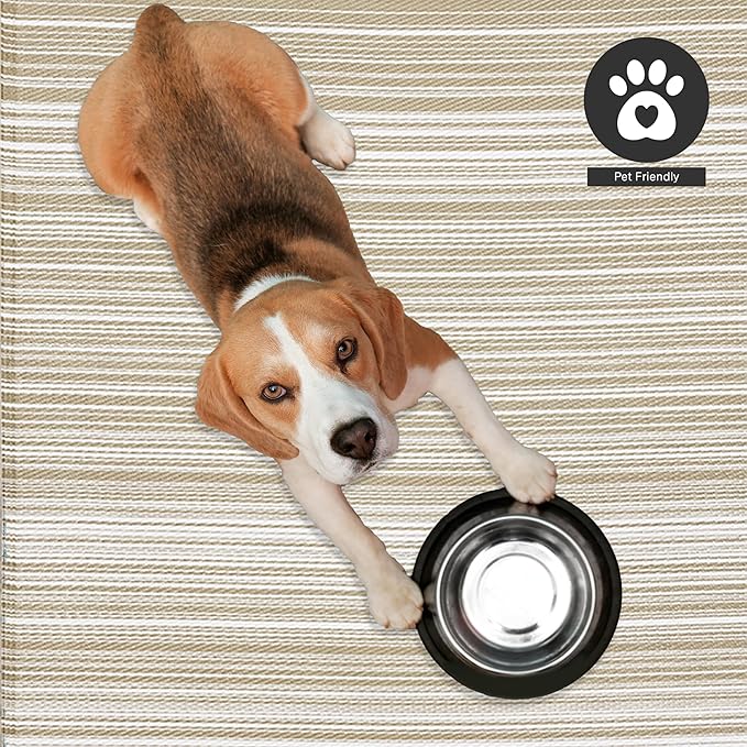 FH Home Outdoor Rug - Waterproof, Fade Resistant, Reversible - Premium Recycled Plastic - Striped - Patio, Deck, Porch, Balcony - Havana - Beige Crease Free - 5 x 8 ft