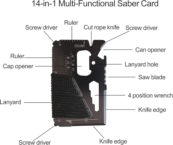- 【14-in-1 Multi-Tool Survival Card】 This compact stainless steel tool card features: can opener, knife edge, screwdriver, bottle opener, 4-size wrench, butterfly wrench, ruler, saw blade, direction indicator, 2-size wrench, key ring hole, and lanyard hole – all in the size of a credit card.