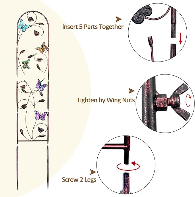 - 【Garden Decor】This pair decorative flower trellis features 10 Butterfly perch on the cattails with bronze powder coating, and it comes with ornate leaf curling design which encourages your climbing vines and flowers to flourish.The butterflies are made of artificial paint, close to a realistic rainbow gradient effect.