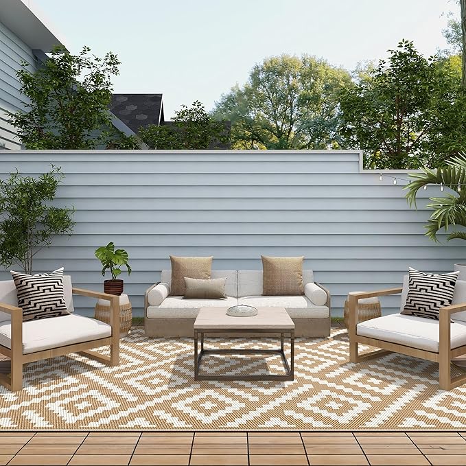 - Extended Lifespan · Dual-Sided Wear Resistance: The GENIMO outdoor rug features a reversible design with two classic geometric patterns, doubling its lifespan through alternating use. The dark-toned surface effectively conceals dirt, stains, and fall debris, maintaining a pristine appearance even in rugged environments. Perfect outdoor patio rugs, RV mats, and camping rugs for indoor-outdoor transition zones—effortlessly switch sides for practicality and timeless decor.