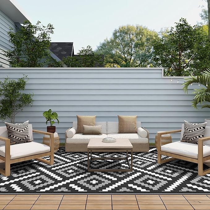 GENIMO Outdoor Rug for Patio Clearance, 6'x9' Waterproof Camping Mat, Reversible Plastic Straw Rugs for RV, Camper, Balcony, Backyard, Picnic, Deck (Mix Black White)