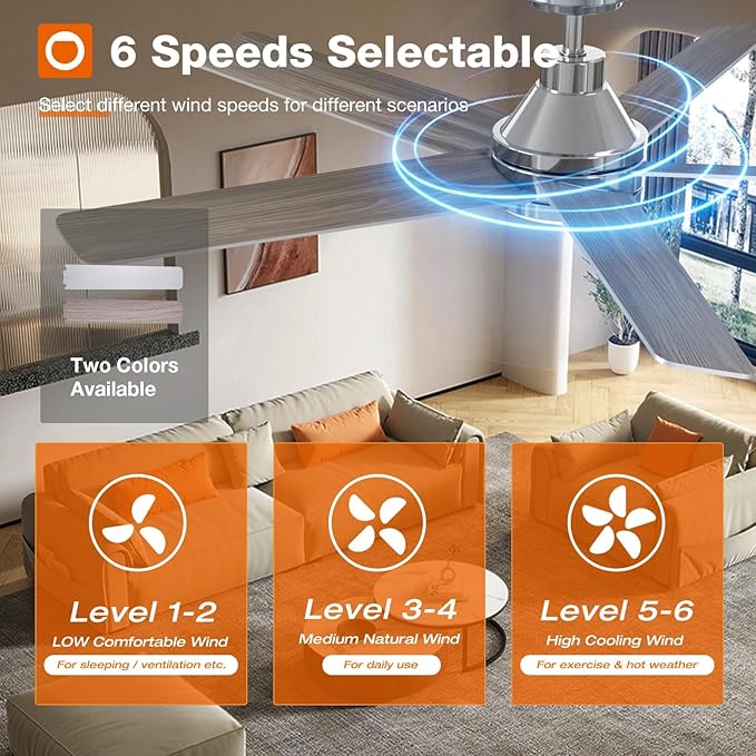 - Reversible DC Motor: The high-quality & high-speed motor brings a perfect wind experience. The wind speed can be adjusted in 6 gears, you can choose between comfortable wind, natural wind and strong wind. Reversible dual-direction fan improves air circulation to keep you warm in winter and cool in summer. Our fan blades are double sided in different colors, one side is white and the other side is yellow wood grain. Choose the fan blade color that best fits your home decor!