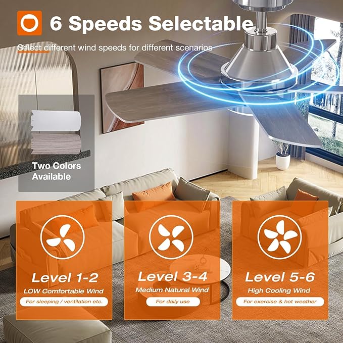 - Reversible DC Motor: The high-quality & high-speed motor brings a perfect wind experience. The wind speed can be adjusted in 6 gears, you can choose between comfortable wind, natural wind and strong wind. Reversible dual-direction fan improves air circulation to keep you warm in winter and cool in summer. Our fan blades are double sided in different colors, one side is nickel and the other side is oak grain. Choose the fan blade color that best fits your home decor!