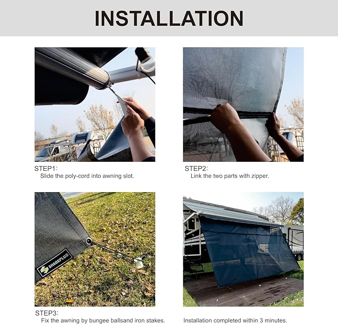 - EASY TO INSTALL:SHADEPLUS RV Awning Shade Screen is easily installed by sliding the poly cord into the awning roller tube, and then securing it with bungee balls and iron stakes. The entire installation process can be completed in just 2-3 minutes.