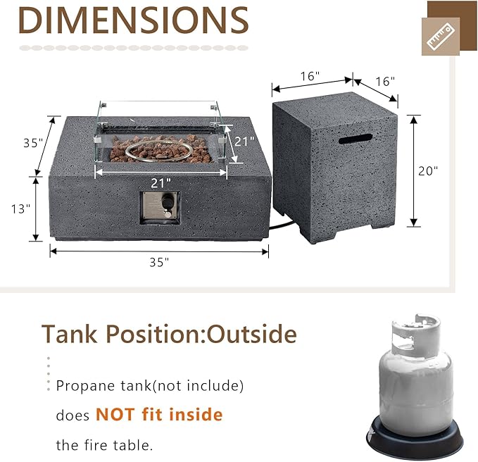 - đ„ăSpacial Economyă: Large enough coffee table surface to set your coffee or nightcap. The entire piece can easily be picked up from the side handles by two people. It fits a 20lb propane tank which should be put outside the fire table.