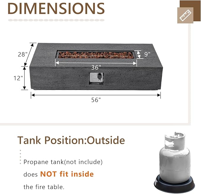 - đ„ăSpacial Economyă: Large enough coffee table surface to set your coffee or nightcap. The entire piece can easily be picked up from the side handles by two people. It fits a 20lb propane tank which should be put outside the fire table.