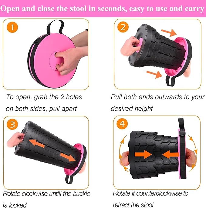 - [Easy to Use, Multipurpose]: Super easy to use. You can open the collapsible stool by holding both ends and pulling to open with slight turning them, perfect for indoors and outdoors. Indoor occasions such as the living room, bedroom, bathroom, kitchen, office. Outdoor activities: drawing room, garden, hiking, BBQ, camping, queue, fishing, etc