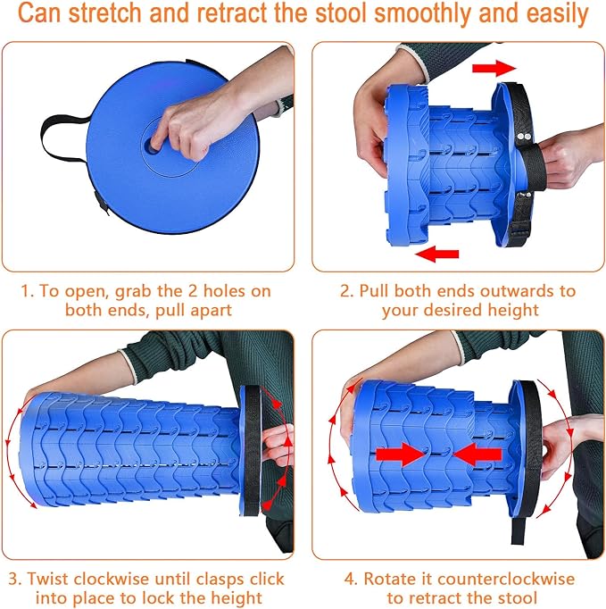 - PORTABLE & LIGHTWEIGHT: This telescopic stool is only 2.54 pounds with dimeter 9.84 inches/250mm. The adjustable strap makes the stool easy to carry in your hand or hanging on your shoulder. Perfect to use for camping, fishing, hiking, hunting, picnic, BBQ. Also can be used in living room, bedroom, bathroom etc