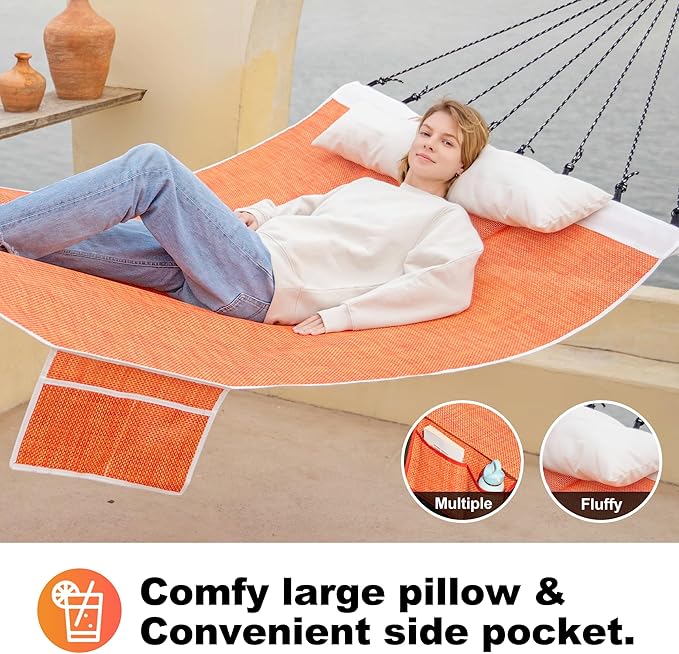 - ✅WATERPROOF & DURABLE TEXTILENE FABRIC: Weather-resistant hammock is made of Textilene, which is Quick-drying, non-fading, breathable, comfortable, durable, easy to clean and quick drying. It can greatly reduce your daily maintenance costs.