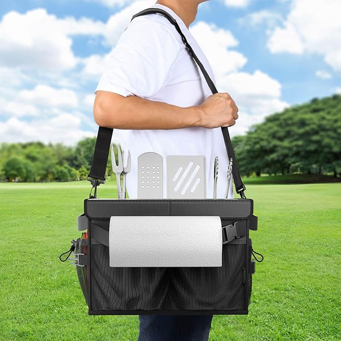 - Multifunctional Pocket: Measuring 15.8”×11.8”×10.6”, the caddy features with 2 main roomy interior spaces to fit large items, 5 slots for cooking utensils, 2 adjustable mesh side pockets to accommodate larger items or retract openings to prevent item from falling out, 6 side mesh pockets and a paper towel holder. It easily holds spices, condiments, plate, cutlery, napkin, paper towel roll, grill tools, spoon, camping cups, and more