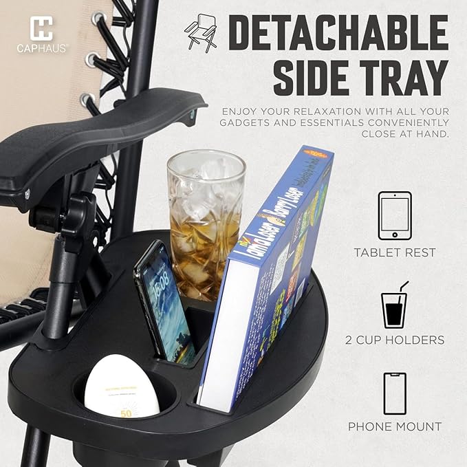- πͺ Convenient Side Tray - The Anti-gravity Chair is not just about comfort; it's also about convenience. The detachable side tray (15.2"W x 9.4"D x 2.6"H) includes 2 cup holders, a phone holder, and a tablet holder. Whether you're sipping your favorite beverage, reading a book, or working on your laptop, you'll love having a dedicated space to keep your essentials within arm's reach. Perfect for outdoor lounging, indoor relaxation, or even as a handy addition to your home office.