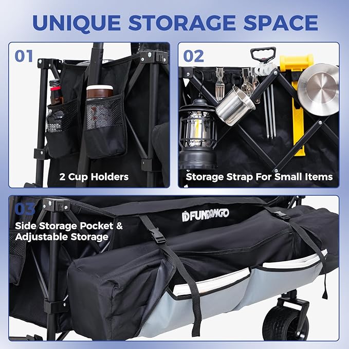 - EXTRAORDINARY STORAGE CAPACITY: FUNDANGO collapsible wagon has a maximum capacity of 300L, featuring a spacious and deep storage area measuring 39" L x 15" D. With 80% more room than most competing folding wagons, it provides unparalleled space to carry everything you need, making it the ideal choice for all your transporting needs