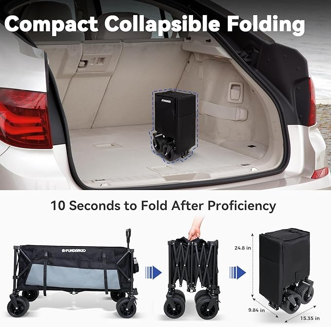 - EXTRA-WIDE WHEELS FOR SUPERIOR PERFORMANCE: Designed to stand out from other narrow-wheeled carts, the FUNDANGO foldable wagon features four durable, 7" diameter, 4" wide, silent wheels. This larger, wider wheel design significantly enhances stability and maneuverability, allowing the wagon cart to easily tackle a variety of terrains. Whether it's sand, gravel, or uneven paths, our wagon outperforms other folding carts in any outdoor terrain