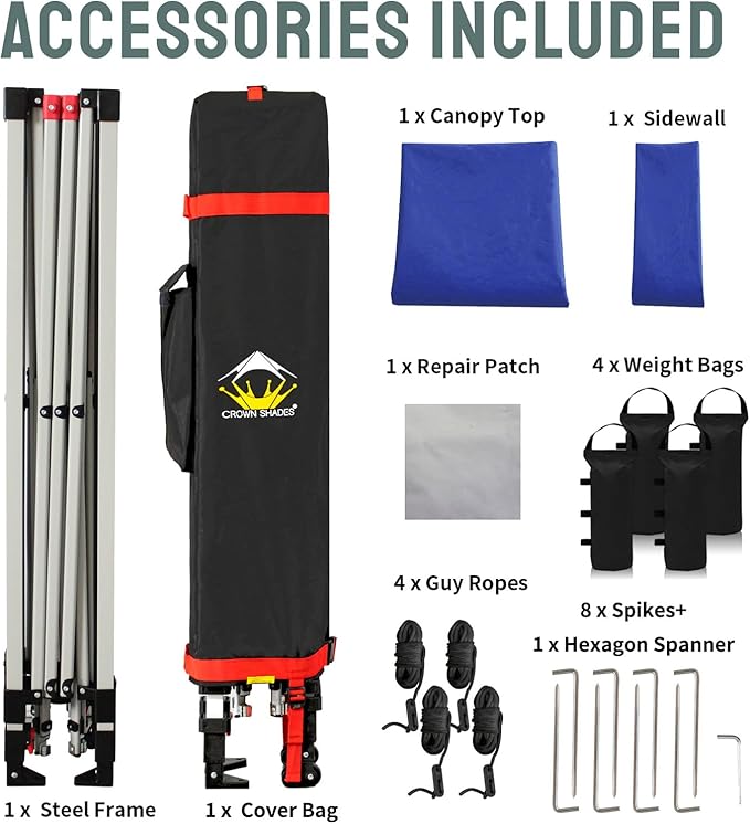- HIGH GRADE STEEL FRAME - The durable, high-grade, corrosion-resistant steel truss frame with hardened through bolts comes pre-assembled and can be set up without any tools. Engineered to support up to 120 lbs. distributed across the frame, it ensures robust and reliable performance. The extended ceiling assembly and upgraded high peak design make it easier for rainwater to run off, preventing water pooling on the canopy. Perfect for extended outdoor use at markets, festivals, and exhibitions