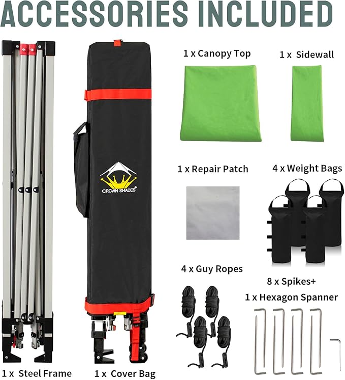 CROWN SHADES 10x10 Pop Up Canopy with 1 Side Wall - Beach Tent with One Push Setup - Outdoor Sun Shade for Events, Parties, Camping - Gazebo with STO-N-Go Cover Bag (Green)