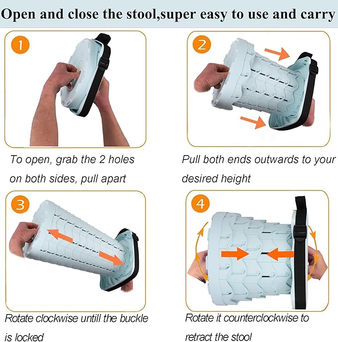 - [Easy to use, Multipurpose]: Super easy to use. You can open the collapsible stool by holding both ends and pulling to open with slight turning them, perfect for indoors and outdoors. Indoor occasions such as the living room, bedroom, bathroom, kitchen, office. Outdoor activities: drawing room, garden, hiking, BBQ, camping, queue, fishing, kitchen, etc