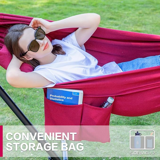 PNAEUT Double Hammocks with Stand for Outside, Portable Space Saving Heavy-Duty Steel Stand for Indoor Outdoor Patio with Carrying Bag, 450 lbs Capacity (Cherry)