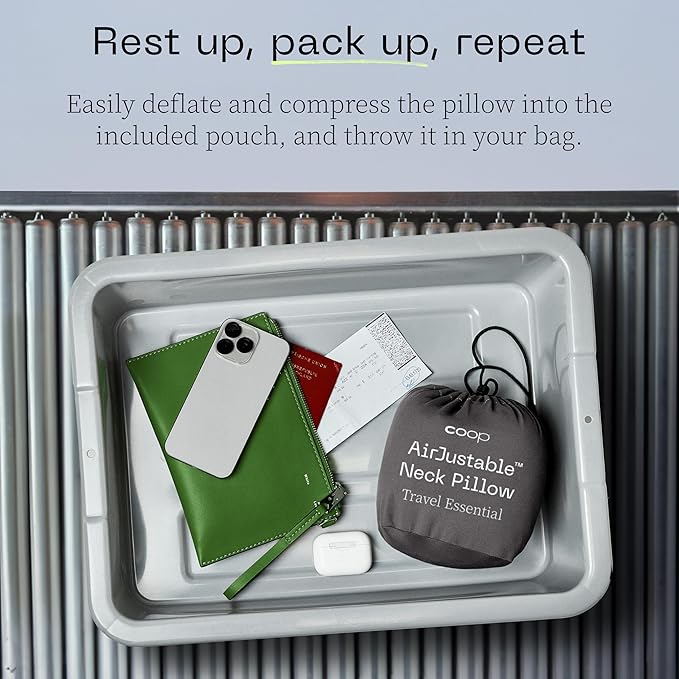 - The Ultimate Customizable Travel Essential: Bring Coop’s signature adjustable comfort anywhere with the AirJustable Travel Neck Pillow. This airplane pillow features a unique inflatable design, offering personalized head, neck, and chin support that adapts to your sleep style. Featuring Coop’s memory foam Oomph fill and an adjustable cord, this travel pillow provides unmatched comfort in any position. Say goodbye to neck strain and restless naps, and enjoy deep, restful sleep on your travels!