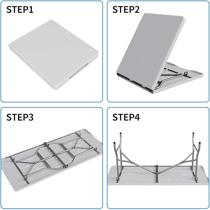 - FOLDABLE DESIGN: The 6-feet folding table folds with built-in carrying handles for easy portability and transport between locations. Once folded, the table can be easily stored in a closet, garage or car trunk for future use. You can take it wherever you need it, from the living room to the campsite to the workplace.