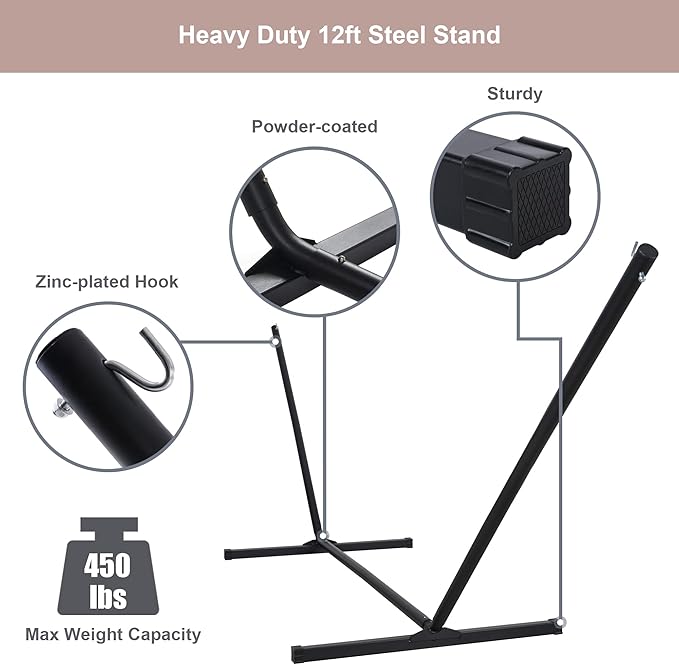 - Durable Frame: The portable hammock stand is made of heavy duty powder coated steel tube which will extend the service life of your freestanding hammock. And it is stable to support up to 450 lbs. You may protect the environment from choosing a hammock with stand, cause it does not require tree straps and will not harm trees