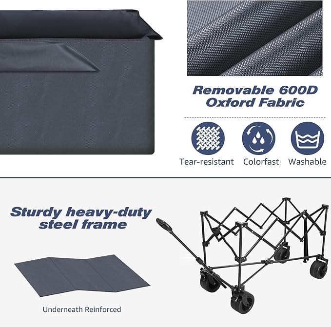 - High Capacity and Durability:Ample Storage Space.With a generous 254-liter capacity, the cart can hold a wide variety of camping gear, including tents, sleeping bags, cooking equipment, and more, reducing the number of trips needed to transport your belongings.Durable 600D Oxford Fabric.The ultra-durable material ensures that the cart can withstand the rigors of outdoor use, protecting your gear from the elements and rough handling.