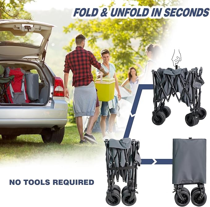 - Compact and Easy Storage:Foldable Design.The cart can be quickly folded and stored in its dustproof bag when not in use. Its ability to stand upright in storage saves space in your vehicle or tent, keeping your campsite organized and clutter-free.Its thoughtful construction and attention to detail make it an indispensable tool for anyone looking to simplify their outdoor tasks and enhance their efficiency.