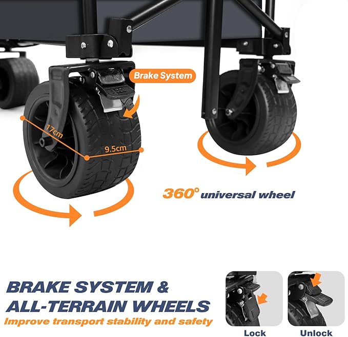 - Enhanced Mobility and Stability:Large, Robust Wheels. The wheels, with a 17 cm diameter and 9.5 cm width, provide excellent stability and smooth movement over diverse terrains, from rocky paths to sandy beaches.Swivel Wheels with Brakes.The swivel wheels offer superior maneuverability, making it easy to navigate through campsites.The sturdy construction and integrated brakes ensure your gear stays secure during transport and when stationary, preventing accidental rolling or tipping over.