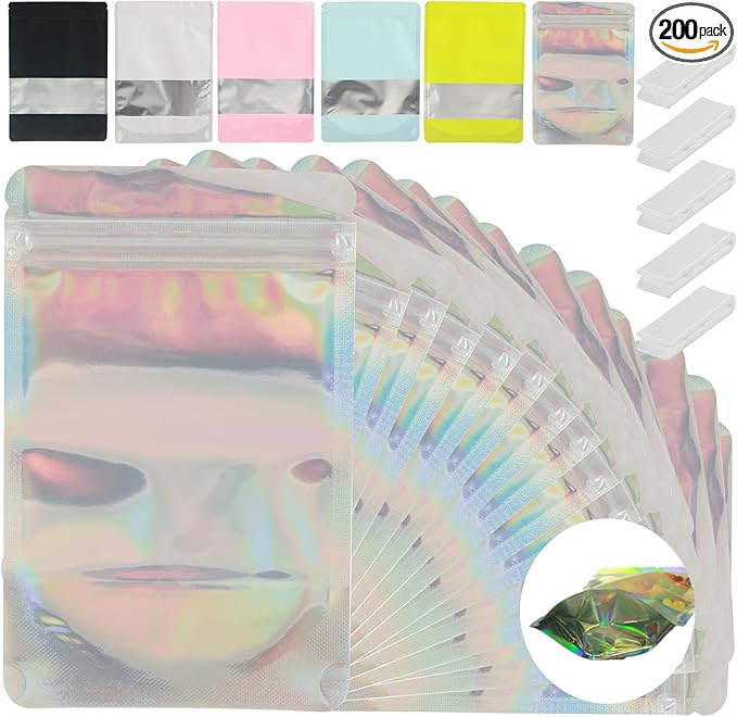 200 Pcs Mylar Bags for Food Storage 6x9 Mylar Bag with Window, Stand Up Holographic Resealable Bags for Food, Smell Proof Bag Freeze Dried Candy Sealable Pouch Jewelry Bracelet Packaging