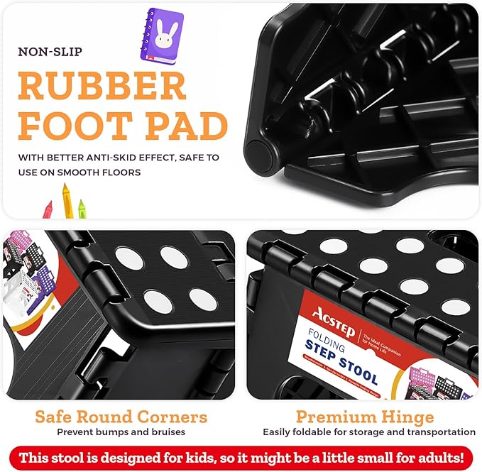 ACSTEP Folding Step Stool Foldable Stool 7.5 Inch Height Kids Step Stool, 300 lb Capacity Plastic Collapsible Stool, Stepping Stool with Handle Black Small Step Stool, Foot Stool Suitable for Kitchen