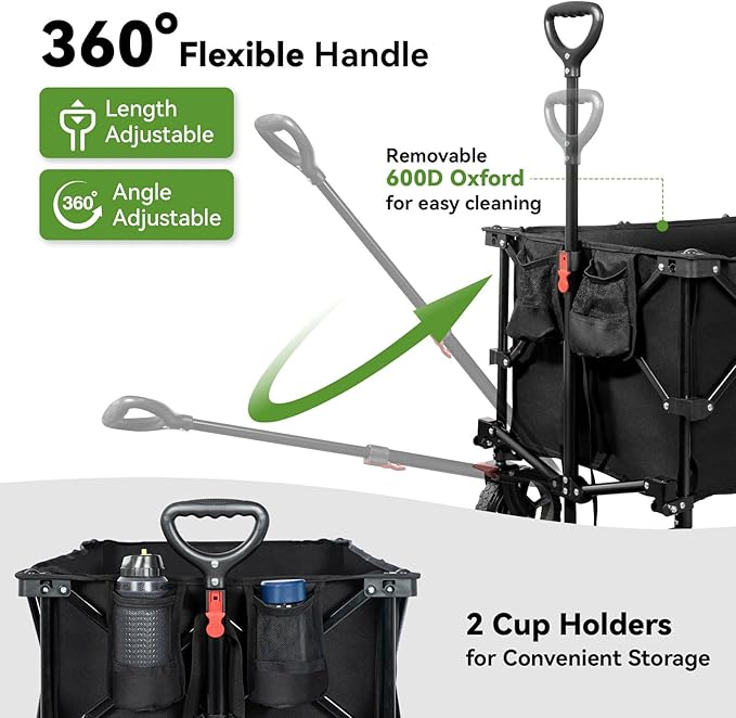 - šššššš ššššššššš š°š¢šš” ššš-ššššššš šššššš: Equipped with large, all-terrain wheels, our utility wagon ensures a smooth pull and easy transport on multiple ground surfaces. The including 360-degree front wheels as well as flexible telescoping handle with rebound function to keep it upright allows you to control the sports wagon and navigate terrain with ease. Our garden cart is delivered assembled and sets up super easily thanks to the clever pull rope design.