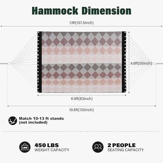 - Size And Weight Capacity: The Double hammock measures 83 inches x 55 inches, with a maximum weight capacity of 450 pounds. Complete with steel chains, the total length of the hammock spans 13 feet. Equipped with two adjustable, multi-link steel chains, you can customize the height to your most comfortable position without any concern of touching the ground