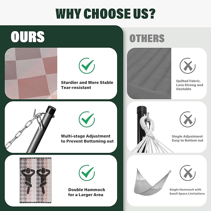 - Versatile Use: Double hammock is suitable for 10-13 feet hammock stand (not included) or between two trees. If you have any questions during use within one year of purchase. We are always here to help