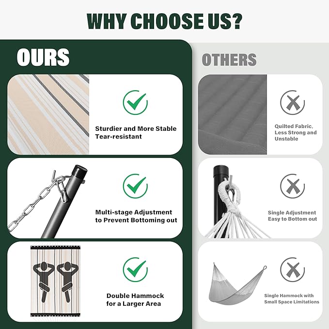 - Versatile Use: Double hammock is suitable for 10-13 feet hammock stand (not included) or between two trees. If you have any questions during use within one year of purchase. We are always here to help
